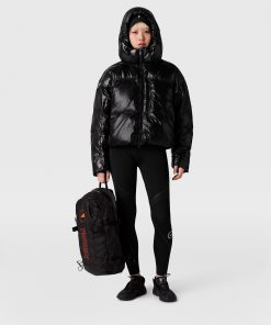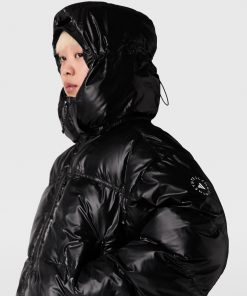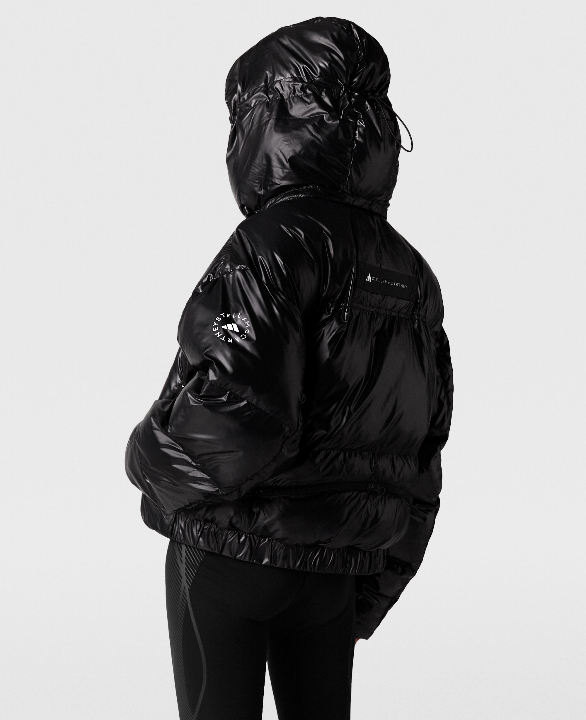 Build your outdoors gym kit with this short padded coat from adidas by Stella McCartney. Made from recycled materials, including its vegan synthetic down padding, the black coat is perfectly equipped for outdoor activity. The coat is primed with WIND.RDY technology to block out wind and rain, and can be packed down into a pocket for easy carry.