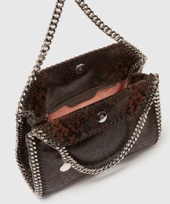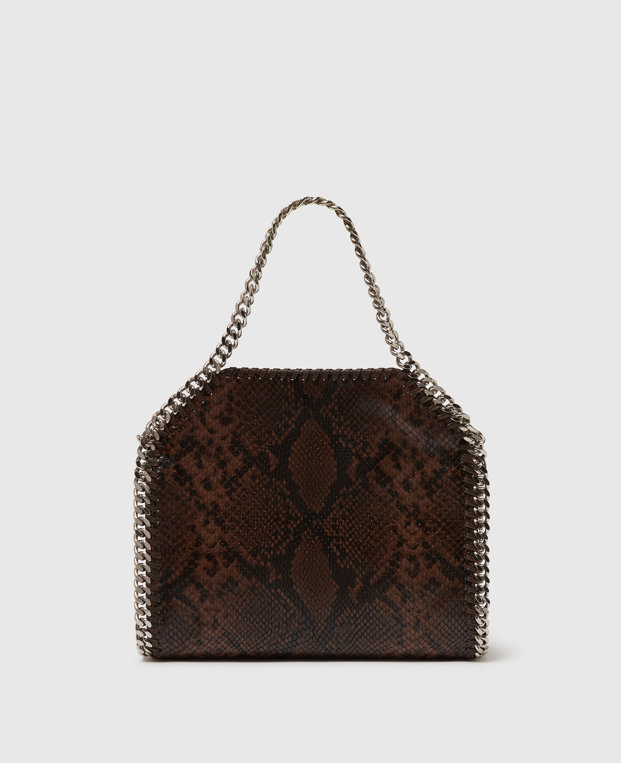 A more compact version of our iconic vegan luxury bag, the Falabella mini tote bag is small but mighty. Consciously crafted from a mycelium-based, vegan alternative to snakeskin and finished with a diamond-cut chain made from recycled brass and aluminum, this tote has a handy inside slip pocket and monogrammed lining made from post-consumer recycled polyester.