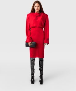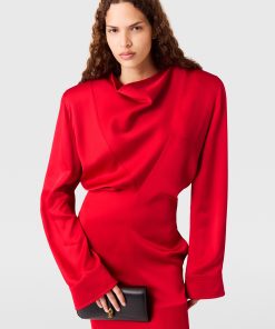 Spun from lustrous, forest-friendly viscose satin, this silky-smooth midi dress begins with a collapsing cowl neck. Bolstered with shoulder pads, its slinky silhouette exemplifies the contrast between sensuality and strength seen in Stella McCartney’s Winter 2025 runway show.