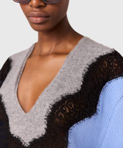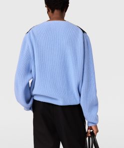 Lingerie codes can be noted from Stella McCartney’s earliest collections to the now. For Fall 2025, these inspirations bring a feminine touch a classic men’s sweater. Spun from RWS-certified wool, its slouchy silhouette begins with a V-neck outlined with lace paneling that slices through contrasting panels.