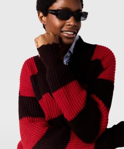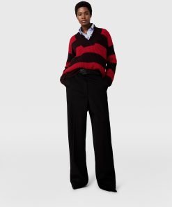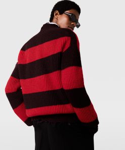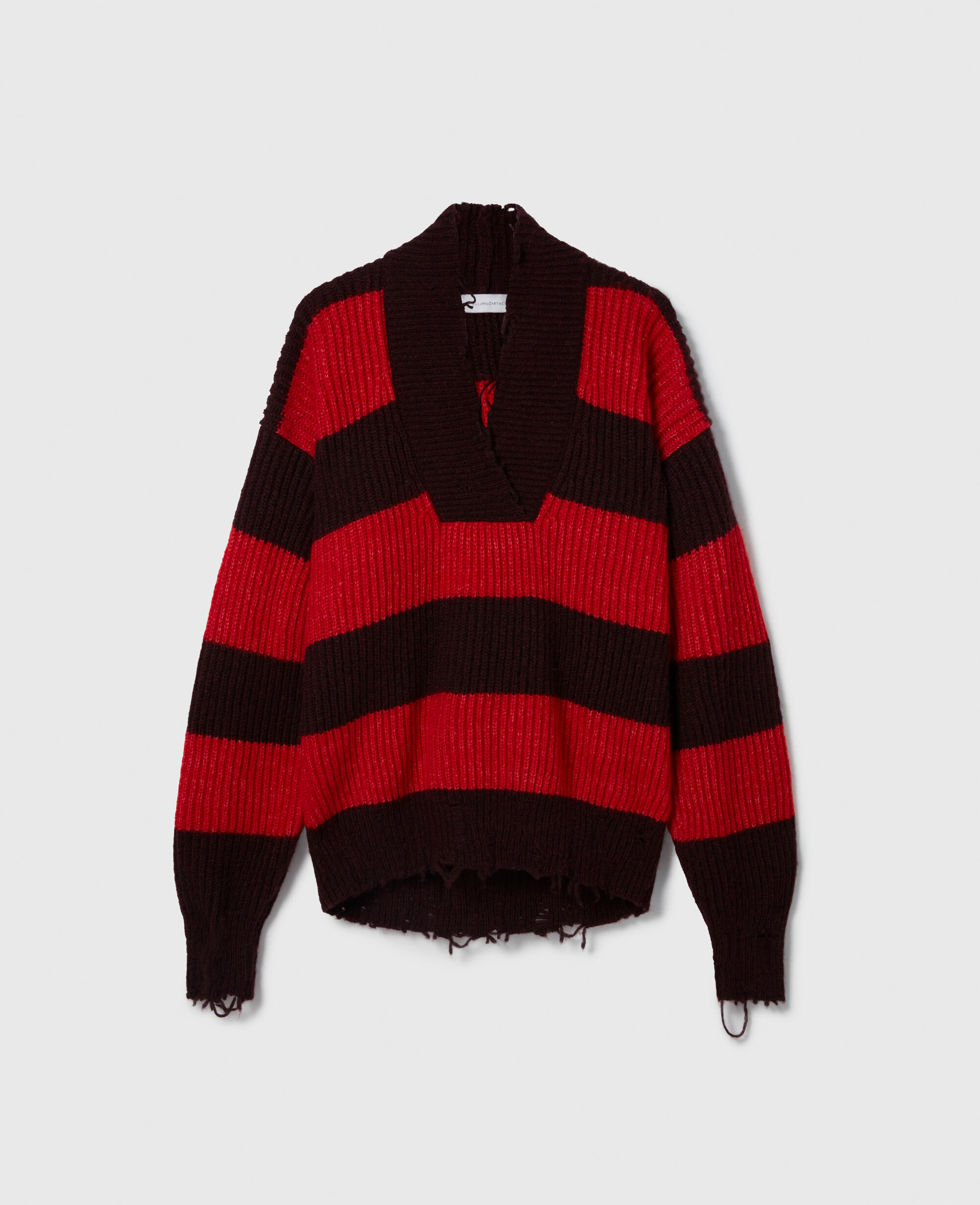 Spun from supremely soft RWS-certified virgin wool, this chunky, striped sweater reimagines a classic boy sweater through a feminine lens. It is topped with a distressed V-neck and cut to an oversized, slouchy silhouette.