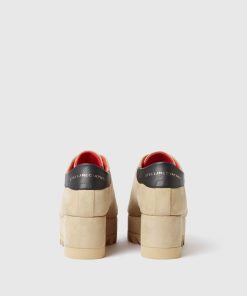 The iconic Sneak-Elyse platform shoes are reimagined in a sportier, streamlined silhouette. Foundational to any Stella wardrobe, these ivory vegan sneakers are crafted cruelty-free from our luxuriously soft alternative to animal leather. A new, lower wedge heel offers maximum comfort, resting on a tonal saw-edge micro sole.